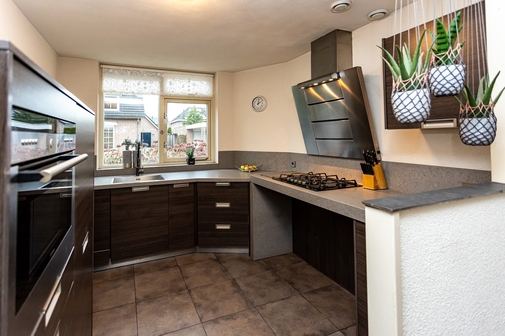keuken in hoekopstelling met diverse inbouwapparatuur, berging met cv installatie en toegang tot de tuin, garage met wasmachineaansluiting.
