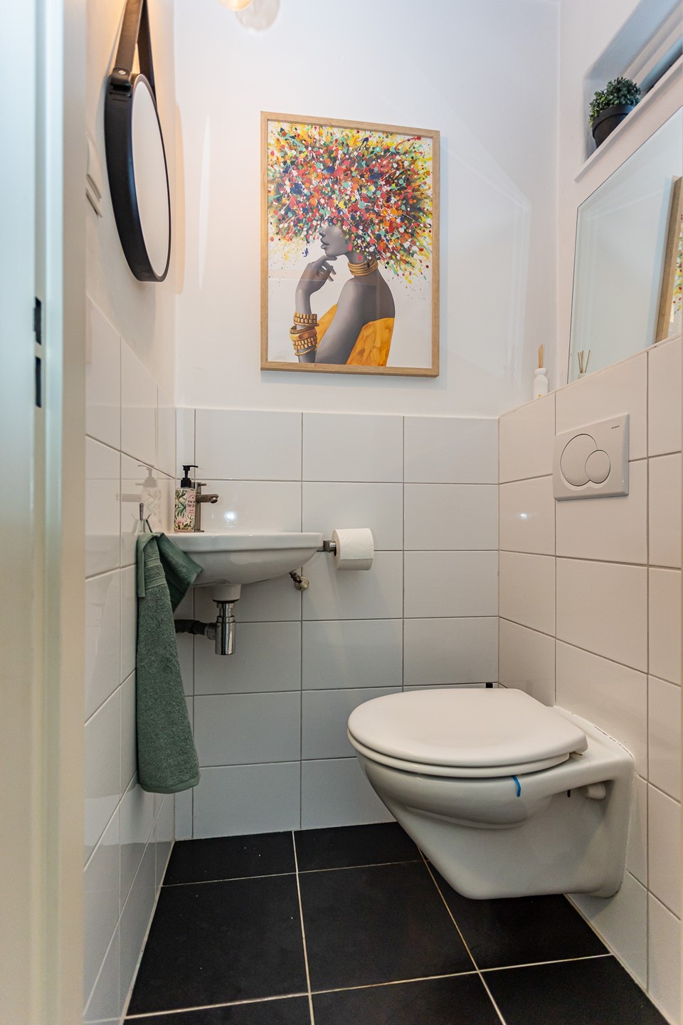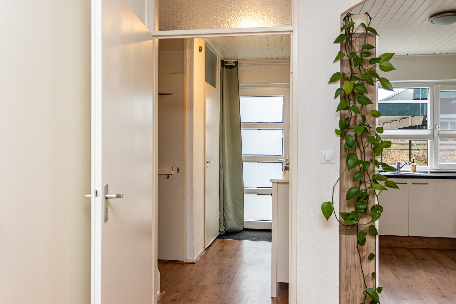 hal/entree, luxe (hang)toilet met fontein, L –vorm eet-/woonkamer met bergkast en airco-unit (koelen en verwarmen), toegang tot terras en tuin, halfopen keuken met