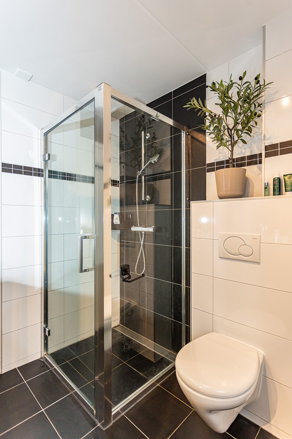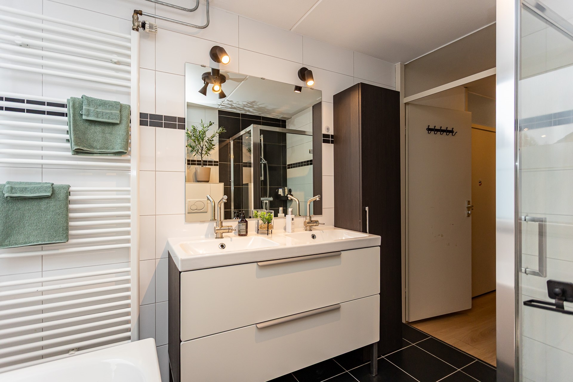 overloop met bergkast, luxe badkamer met ligbad, douchecabine, dubbele wastafel in badkamermeubel, 2e toilet en designradiator, 3 slaapkamers.