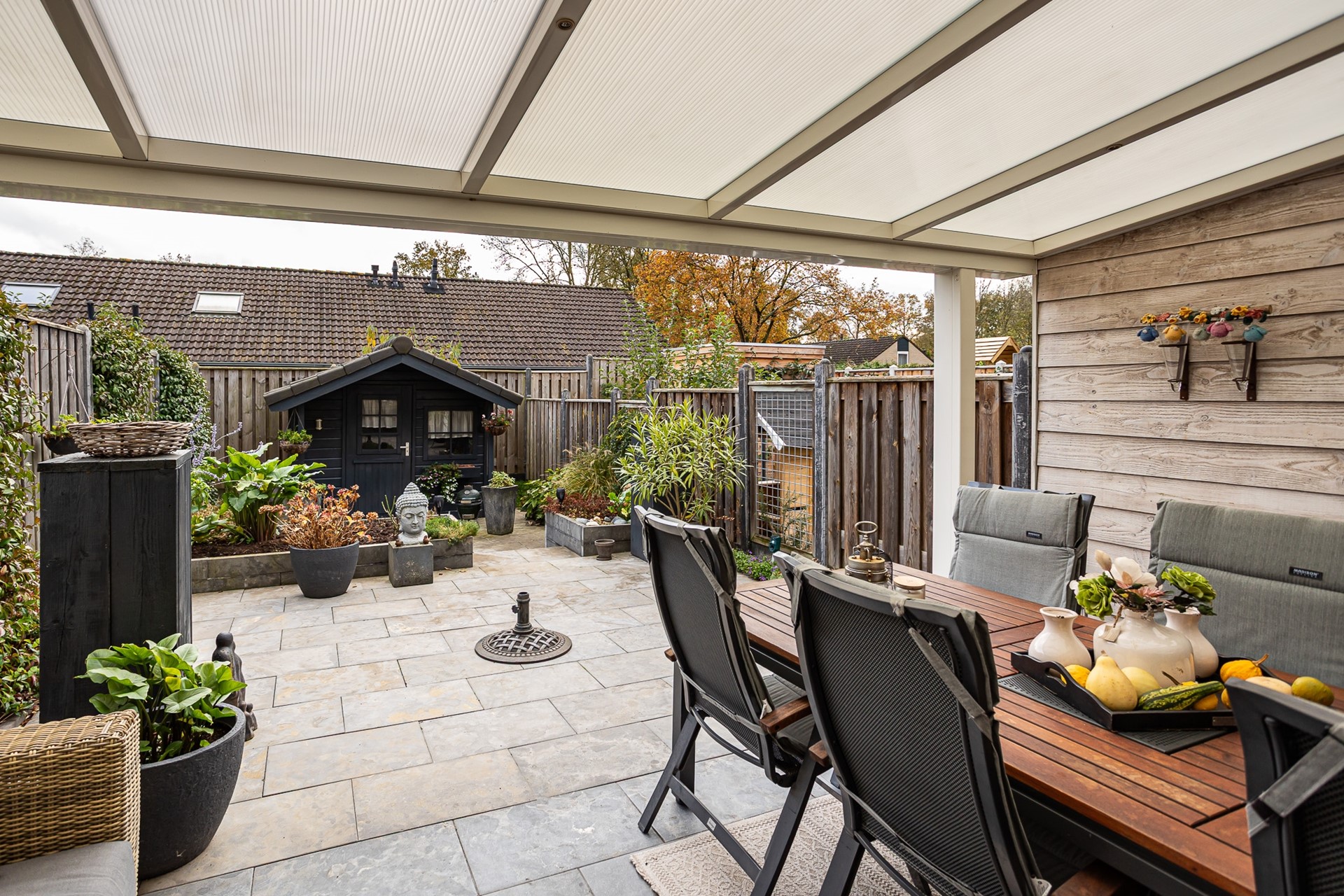 bergkast, toegang tot terras met aluminium overkapping en tuin middels kunststof schuifpui.